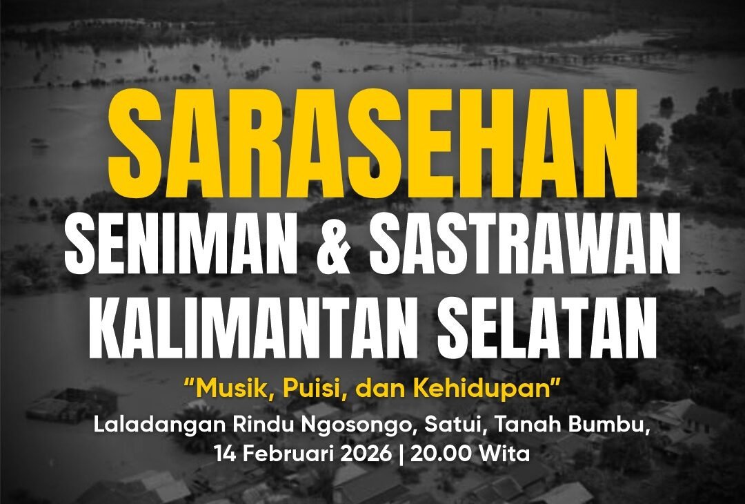 INTERAKSI.CO, Batulicin – Sarasehan Seniman dan Sastrawan Kalimantan Selatan akan digelar di Lalandangan Rindu Ngosongo, Satui, Kabupaten Tanah Bumbu, Jumat (14/2/2026) malam, mulai pukul 20.00 Wita. Kegiatan ini mengusung tema “Musik, Puisi, dan Kehidupan”.