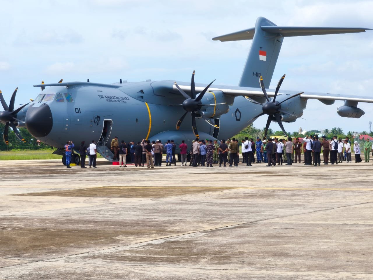 Menhan tiba menggunakan pesawat Airbus A400M milik TNI Angkatan Udara yang baru dibeli belum lama ini.