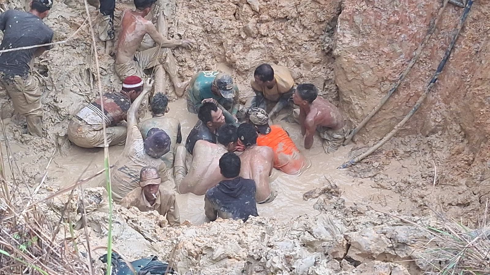 Dua orang mencari butiran intan di bagian atas, sedangkan empat lainnya, termasuk korban, berada di area pengupasan manual di bawah.