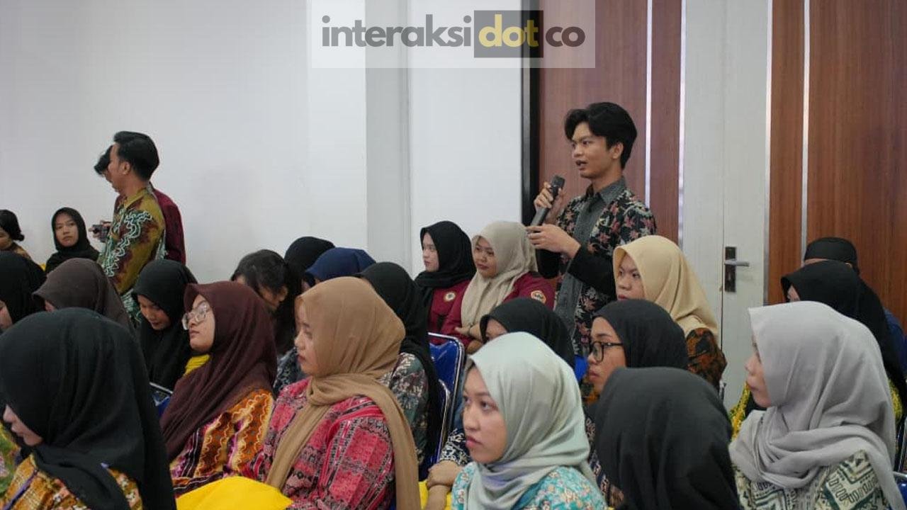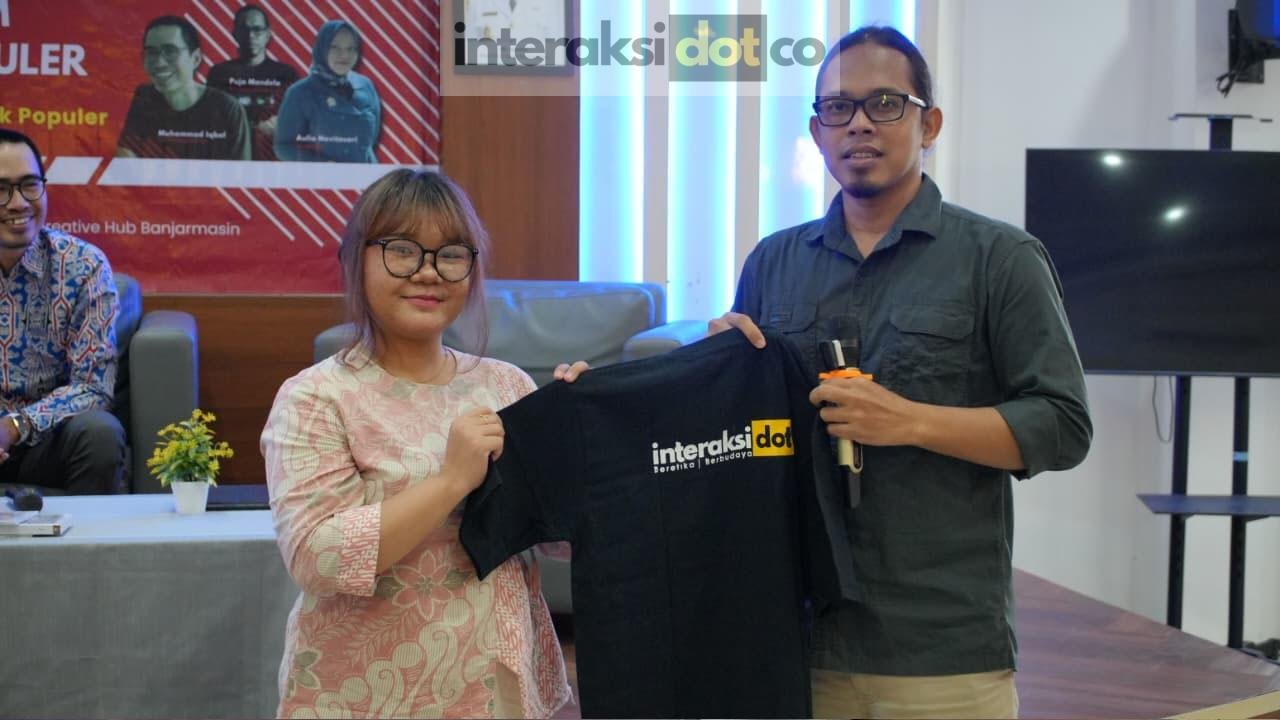 Puja kemudian mengapresiasi beberapa tulisan peserta mata kuliah yang telah dipublikasikan dengan menghadiahkan kaos berlogo interaksidotco dan beberapa buku.