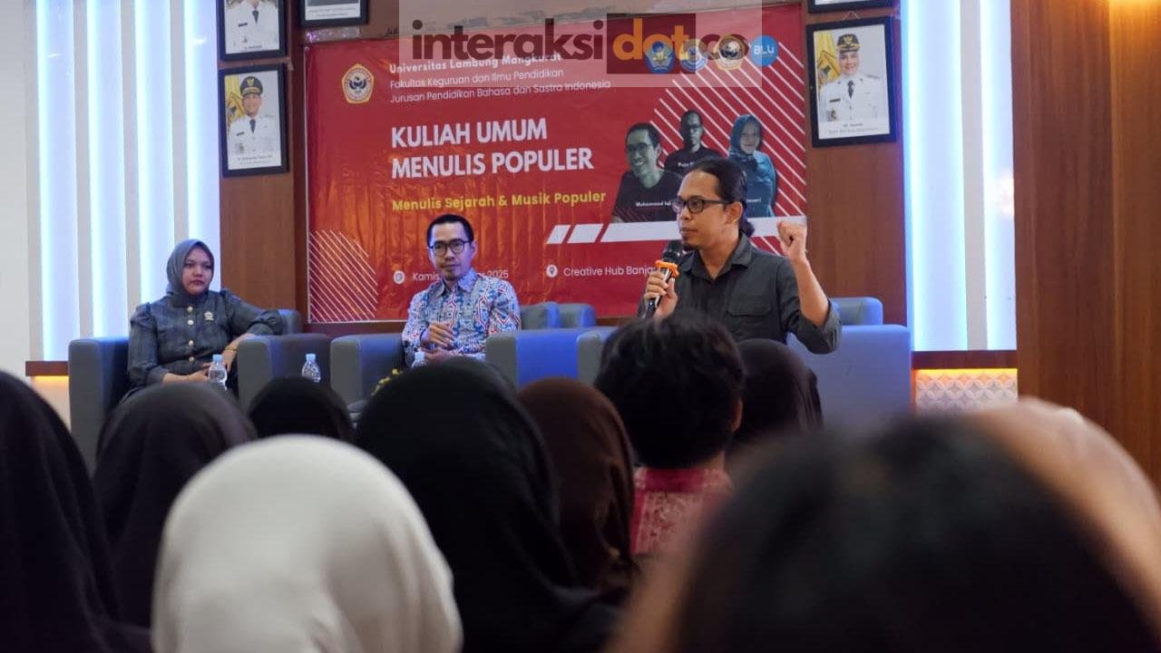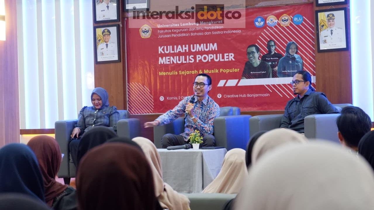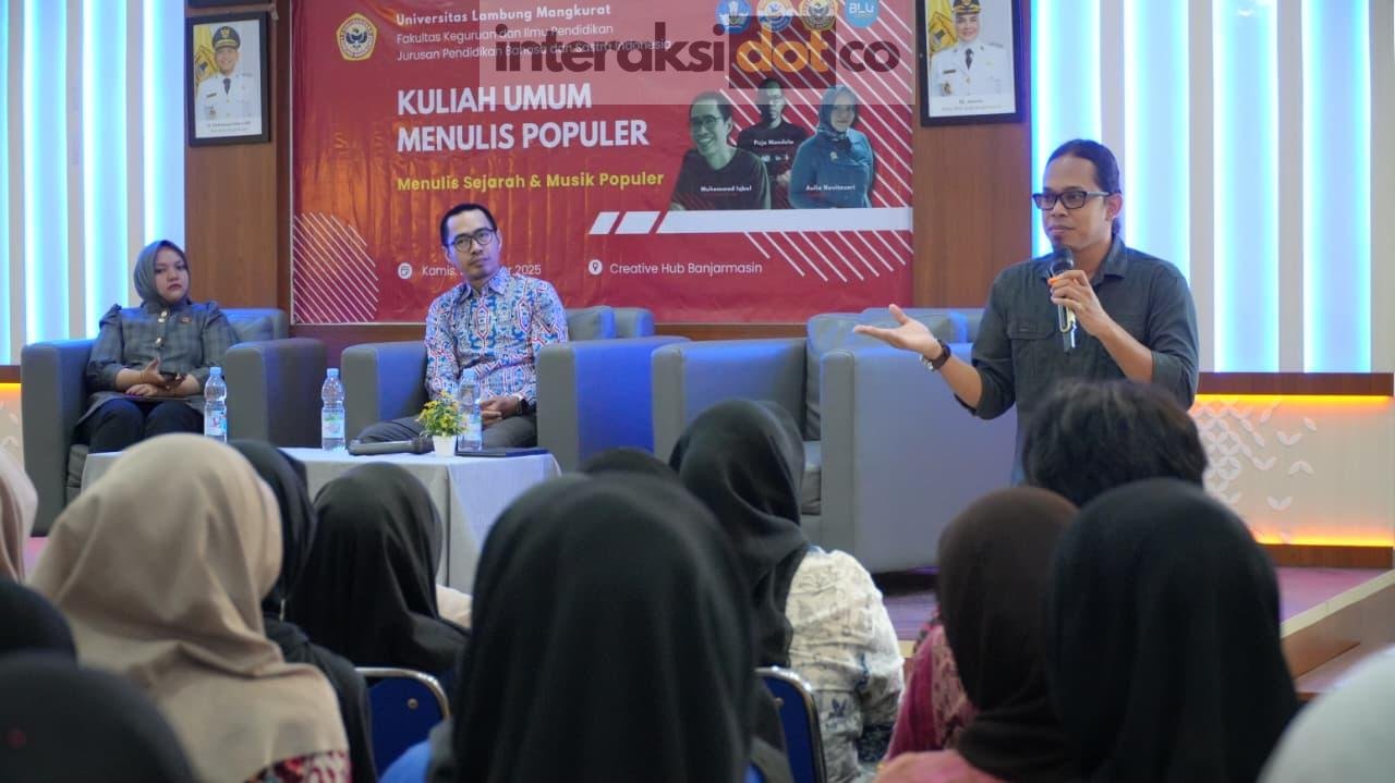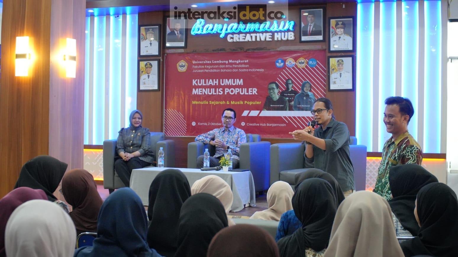 Kuliah umum menulis populer itu menghadirkan akademisi ilmu sejarah dari UIN Palangka Raya, Muhammad Iqbal dan praktisi media dari Tanah Bumbu, Puja Mandela. Masing-masing mendapat waktu bicara 45 menit.