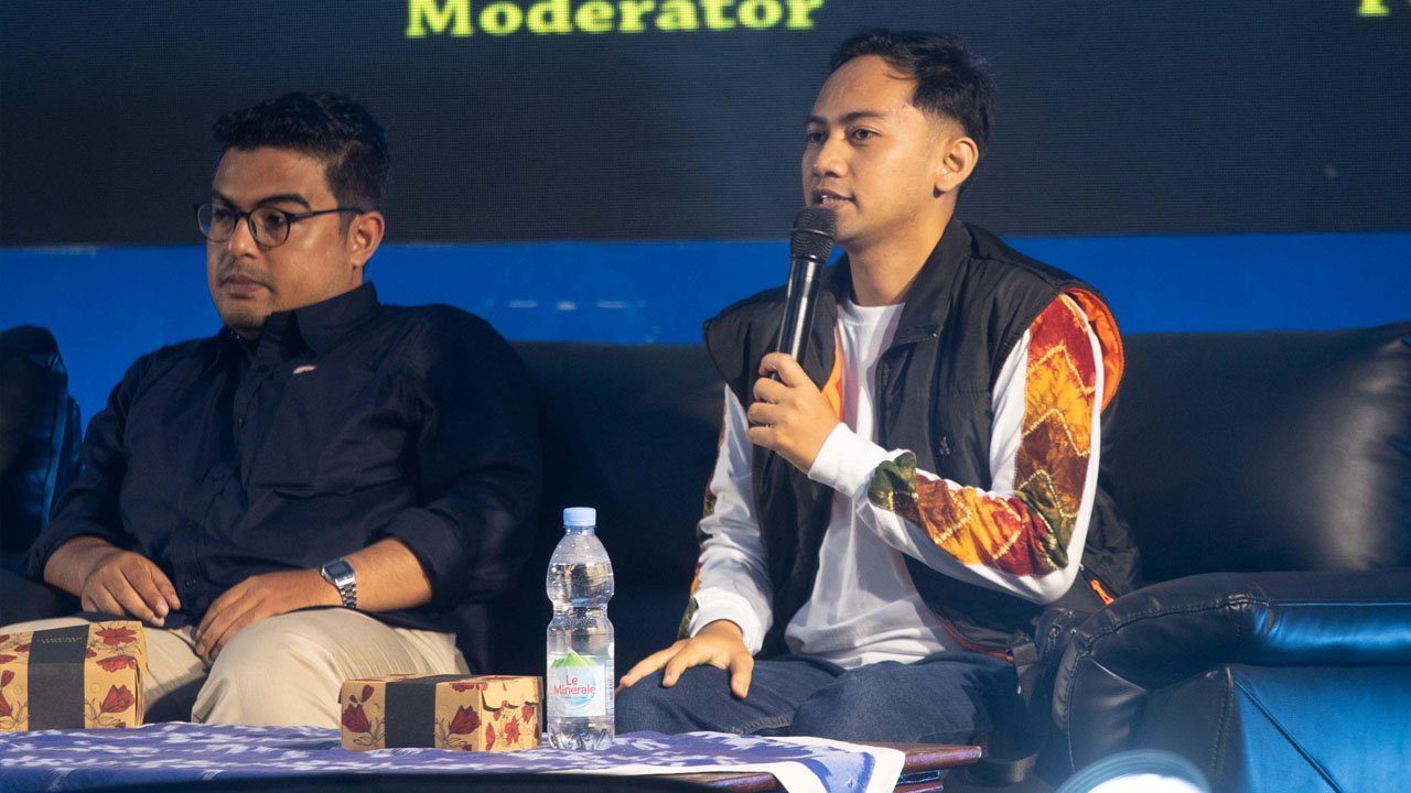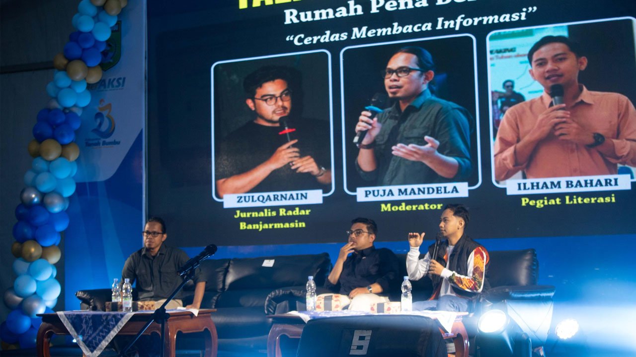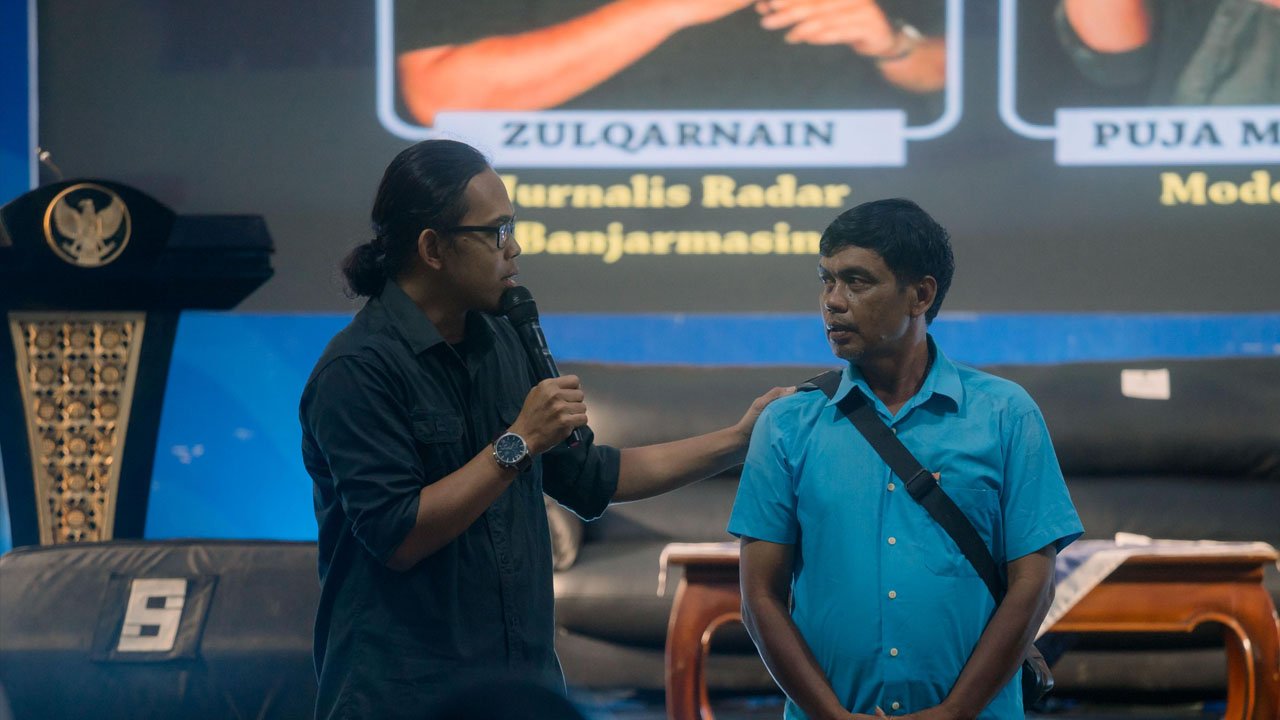 Memasuki sesi inti, dua narasumber muda, Zulqarnain (Reporter Radar Banjarmasin) dan Ilham Bahari (Pegiat Literasi), membedah tantangan literasi di tengah gempuran arus informasi digital.