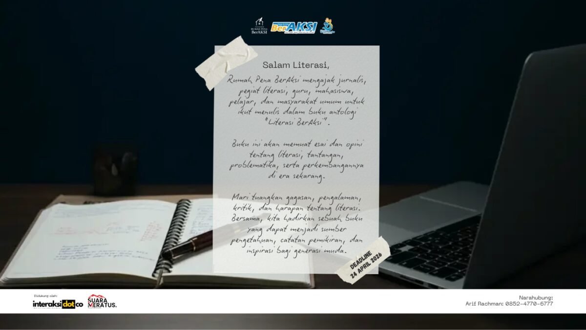 Pengumpulan tulisan untuk buku antologi “Literasi BerAksi” dibuka hingga 24 April 2026. Bagi yang berminat mengirim karya bisa langsung menghubungi Arif Rachman di nomor 0852-4770-6777.