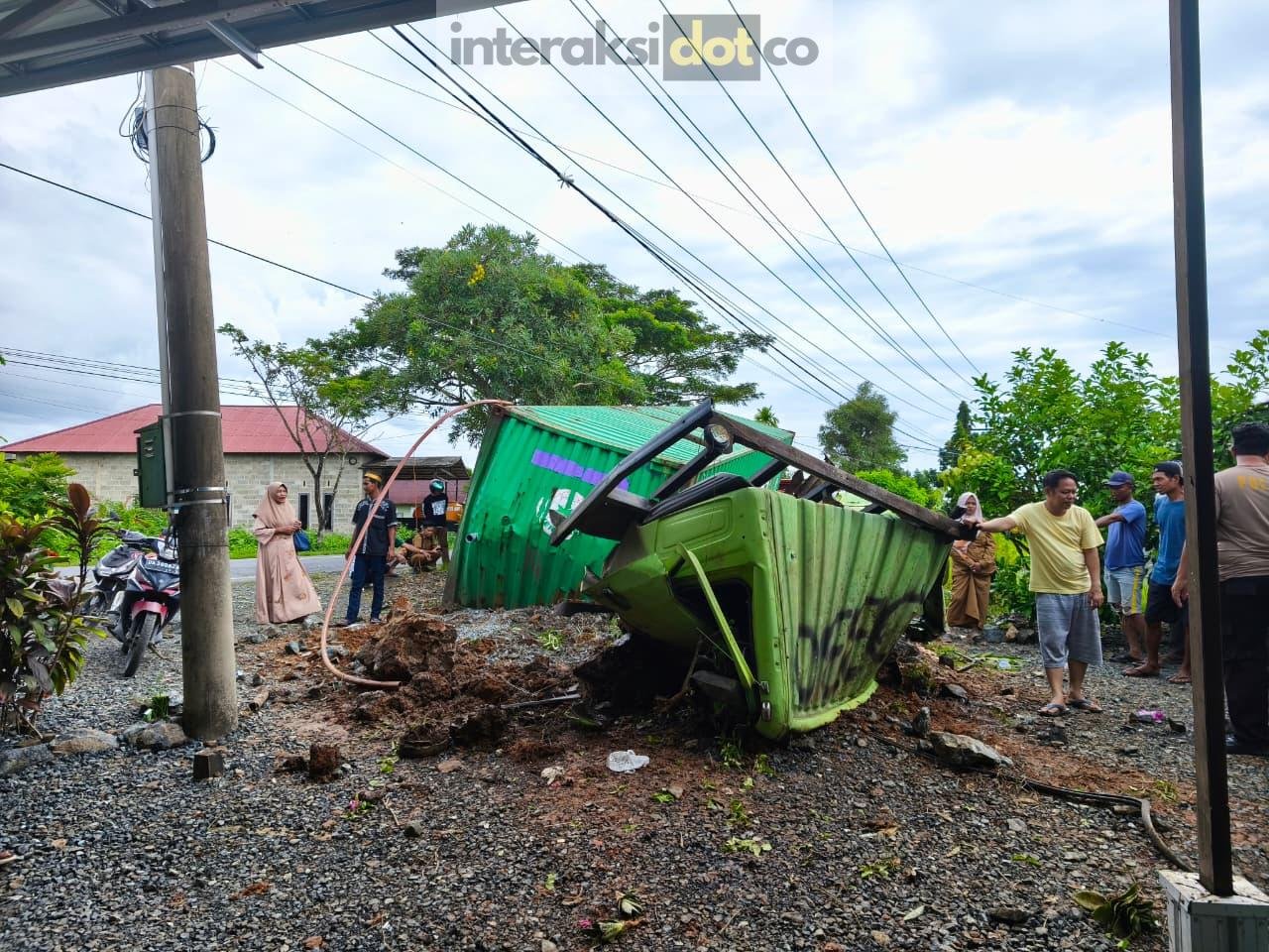 Saat ini, pihak kepolisian telah berada di lokasi untuk melakukan pengamanan dan penanganan lebih lanjut. Warga sekitar juga tampak memadati area untuk melihat kondisi truk dari dekat.