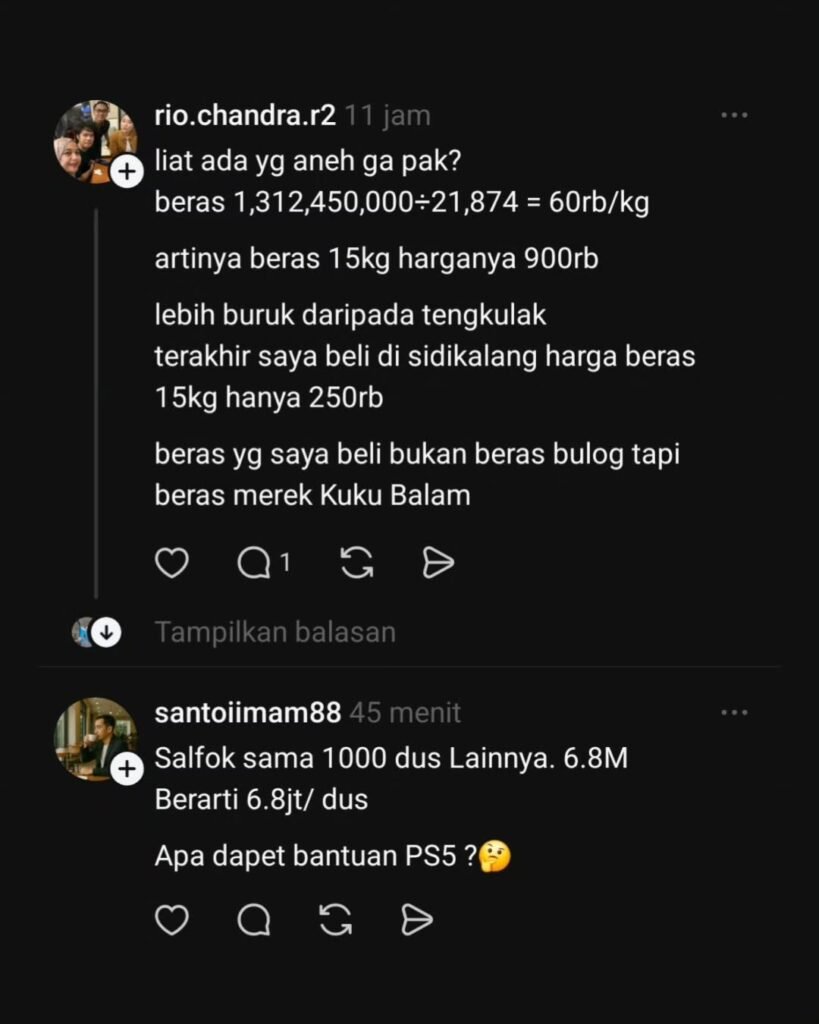 “Liat ada yang aneh nggak pak? Beras 1.312.450.000 ÷ 21.874 = 60 ribu/kg. Artinya beras 15 kg harganya 900 ribu,” tulisnya.