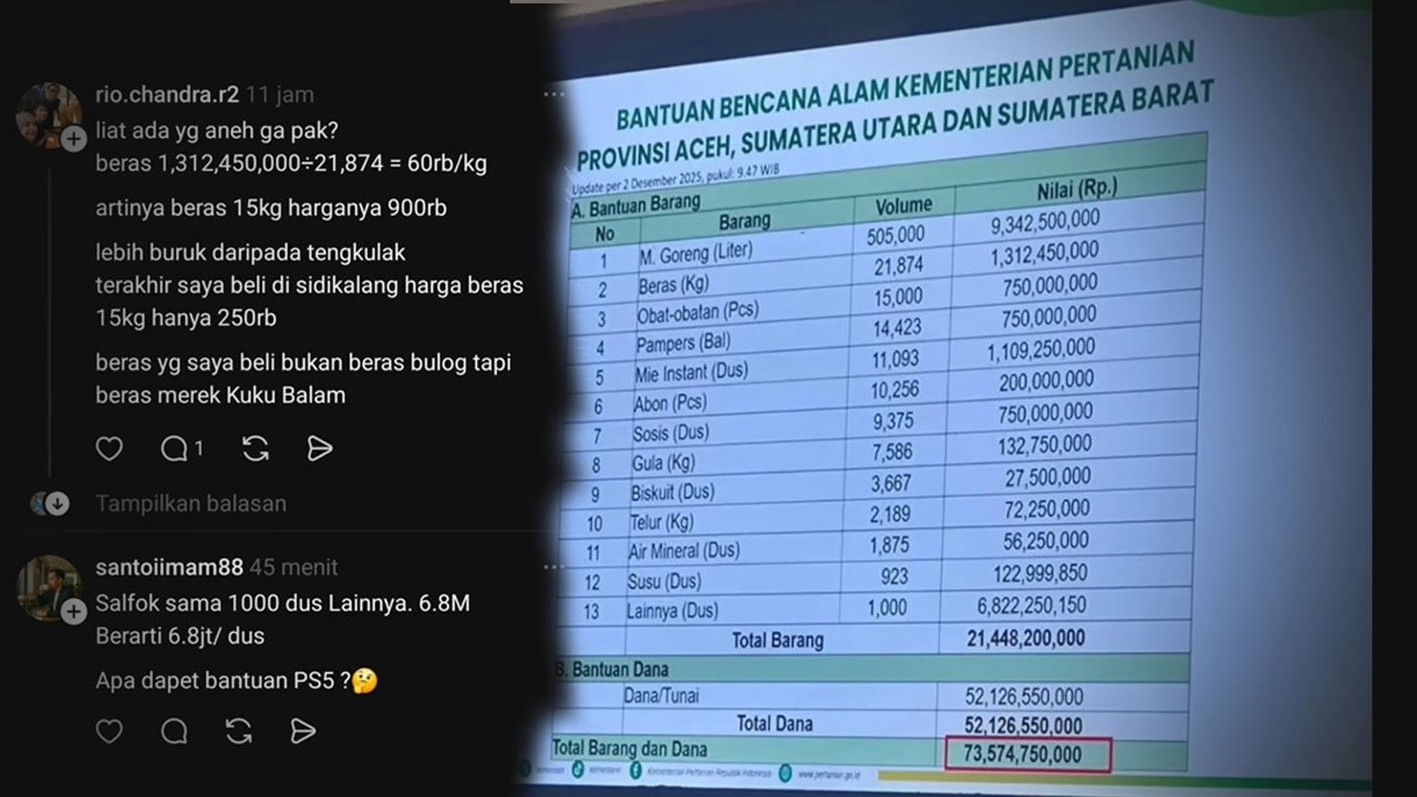 Postingan tersebut memicu diskusi luas dari warganet yang mempertanyakan dasar perhitungan serta transparansi penggunaan anggaran bantuan.